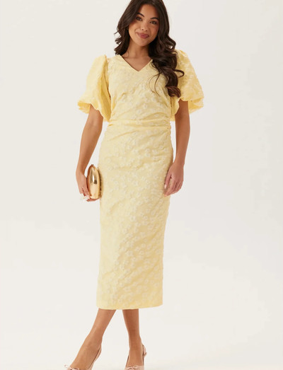 Jacquard patterned dress by BUBBLEROOM- Woven, non-stretch quality- Hidden side zip- Button closure at neck- Puff sleeves- Length from shoulder: 127 cm in size 36- The recycled polyester in this product is certified by a third party. Recycled polyester is mainly produced from recycled PET bottles or from production waste from the manufacturing process. By using materials that are already in circulation, we can save natural resources.