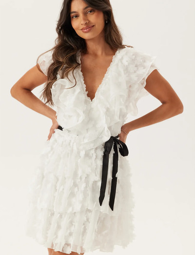 Dress by BUBBLEROOM- Non-stretch material- 3D floral pattern- V-neck neckline- Hidden side zip- Removable tie band at the waist- Lined- Length from shoulder: 88 cm in size 36- The recycled polyester in this product is certified by a third party. Recycled polyester is mainly produced from recycled PET bottles or from production waste from the manufacturing process. By using materials that are already in circulation, we can save natural resources.