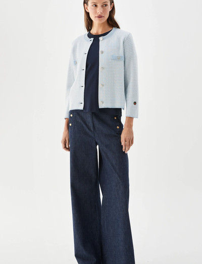 AntibacterialFeaturing a subtle pepita pattern, this jacket offers a refined look. It's designed with a round neckline and adorned with decorative pockets, adding a touch of sophistication. The button closure enhances its classic appeal.