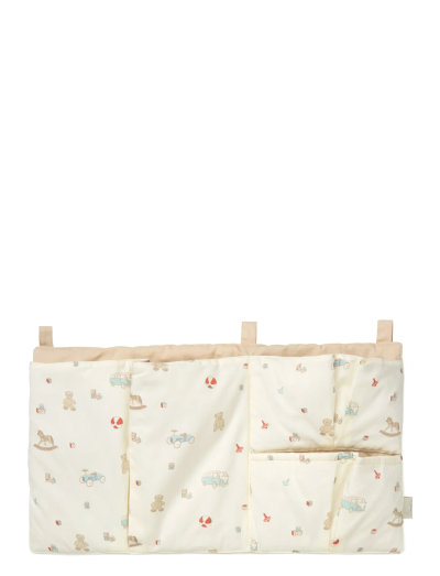 Practical and pretty Bed Pocket to mount on the crib in order to keep pacifiers, books, cuddle cloths, and other sleeping time essentials close at hand. Bed Pocket in green, brown, and blue shades.