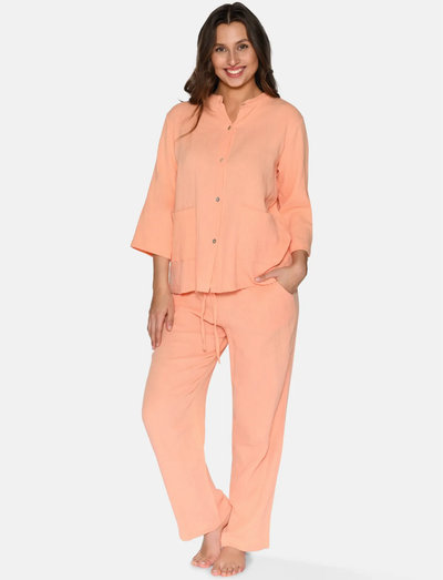 Featuring a band collar and front patch pockets, this lightweight top offers a relaxed silhouette. The three-quarter sleeves and button-down design make it a versatile addition to any wardrobe.