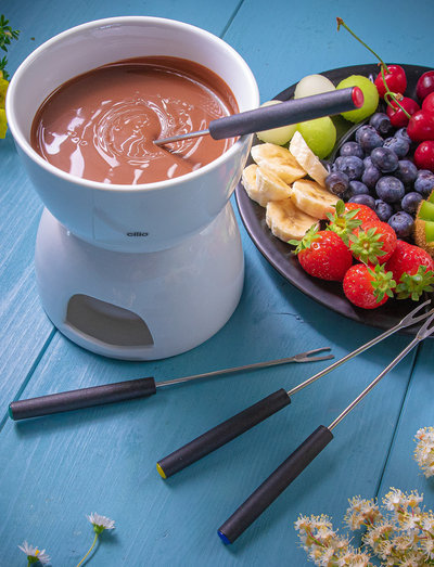 The chocolate fondue set by cilio fulfills the dreams of big and small sweet toothed people. The upper and lower parts are made to fit and stand firmly on top of each other so that nothing tilts on the table.
