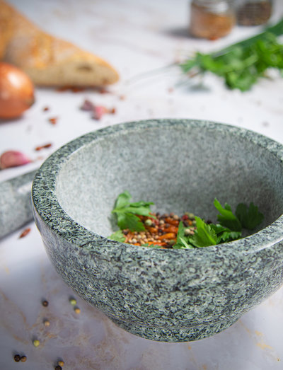 The granite mortar will serve you well. It crushes herbs, garlic, sea salt and much more for spice mixtures, pastes and marinades. It absorbs a good amount of regrind and its solid weight makes it stable when the pestle does its work. The thick-walled granite puts away a lot, essential oils and fruit acids can not harm it.