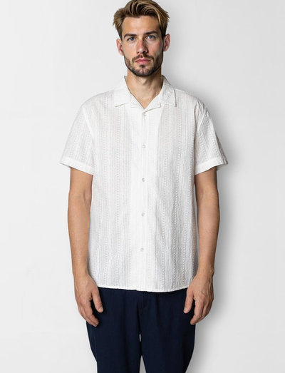 A stylish short-sleeve shirt made from 100% cotton. The patterned fabric adds a unique touch. Designed with a regular/relaxed fit and a classic bowling collar. Model is 188 cm tall and wears size L.
