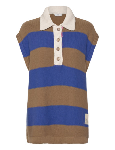 Striped knitwear offers a classic look in this sleeveless polo. Featuring a buttoned placket and a contrasting collar, this piece adds a touch of preppy style to any outfit.