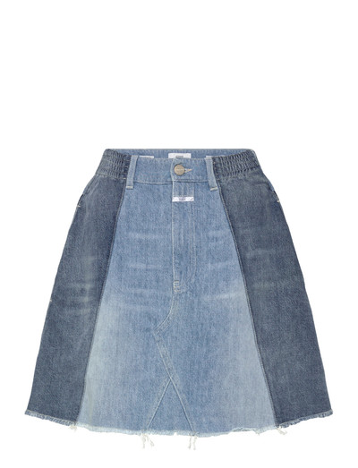 Featuring a patchwork design, this denim skirt offers a unique and stylish look. The garment is crafted with a comfortable elastic waistband and a subtly frayed hem, adding a touch of casual flair.