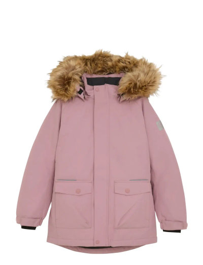 Warm snowjacket for your child in durable material. The material is breathable, windproof and waterproof, so your child can stay out in the rain, snow and wind without getting cold and wet. Tested wear resistance of >60.000 rubs, water column pressure of 10,000 mm. and breathability of 2,000g. The snowjacket closes with a quality zipper at the front. Chin protectors make sure that the zipper feels soft under the chin. The snowjacket has a detachable hood where the fur can be removed. The snowjacket has zip pockets on the outside and reflective details on the back of the jacket and on the sleeve. Other practical features such as inner cuffs with space for the thumb and adjustable outer cuffs that can be closed tightly. There's a name tag inside. Coated with BIONIC FINISH® ECO. Certified acc. to GRS - Made with more than 50% Recycled Material