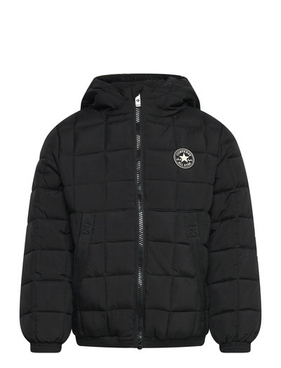 Quilted construction defines this outerwear piece, offering warmth and a distinctive look. It features a full zip closure for easy wear and a hood for added protection against the elements. A logo patch adds a touch of branding.