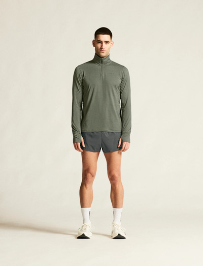 Short zip turtle-neck long sleeve tee made of soft and warming recycled polyester fabric with a peached surface.