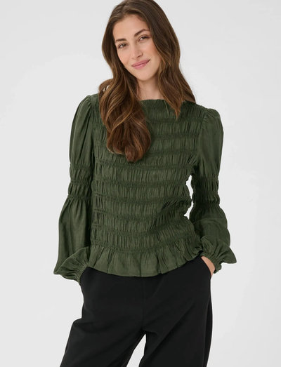 The CRHenva blouse is a fun and feminine blouse, that you can wear with both jeans, pants and a skirt. It is a smock top with elastic gatherings across the body. It has a straight neckline and it has long bishop sleeves. The sleeves have elastic gatherings above the elbows and at the wrists.