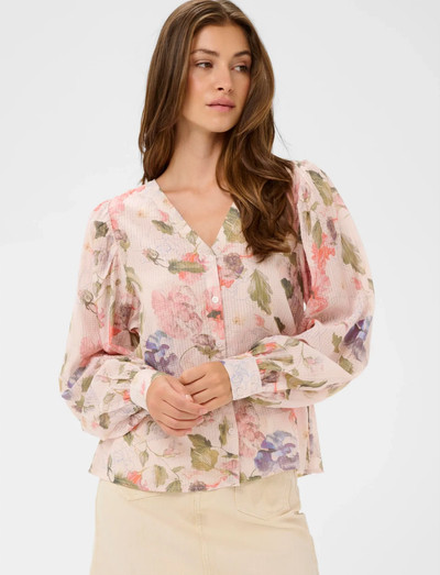 Floral prints add a touch of romance to this long-sleeved blouse. Featuring a V-neck and button-up front, it offers a flattering silhouette and effortless style.