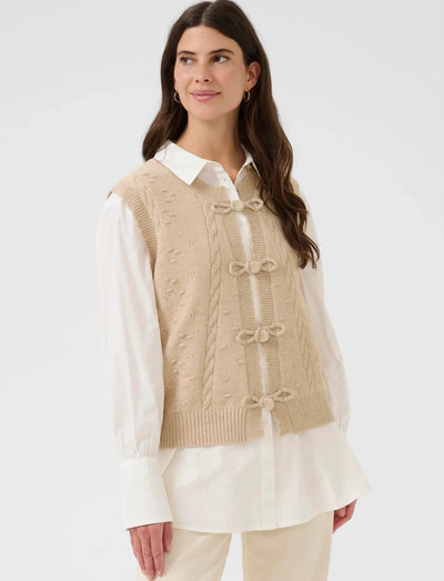 This knitted vest features a charming open front, secured with delicate bow details. The cable knit design adds a touch of texture, making it a versatile layering piece.