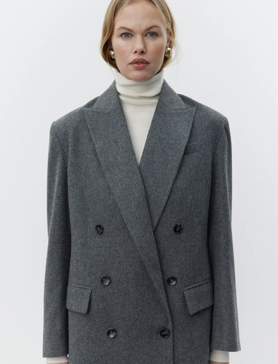 This double-breasted blazer features a peaked lapel, patch pockets on the front, a chest pocket, and an interior pocket. There are padded shoulders and a full lining. The blazer has an oversized fit.