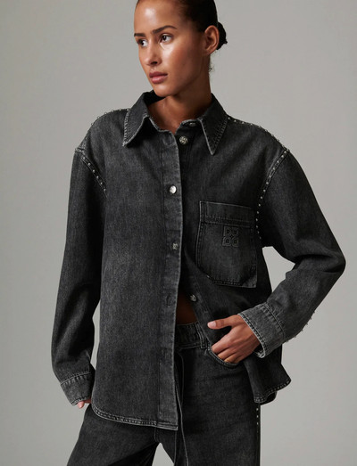 This oversized denim shirt features button closures, a pocket at the chest with a logo, and studs along the shoulders. There is a curved and dipped hem. The shirt has a casual vibe; wear it over a fitted dress for an elevated look.