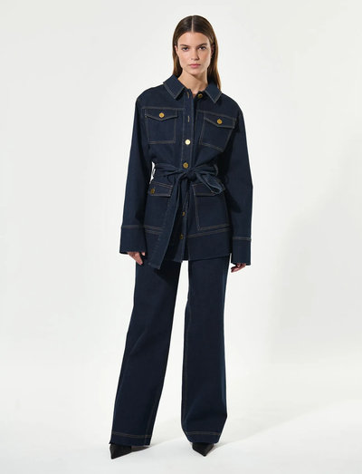 Crafted with a belted waist, this denim jacket offers a tailored silhouette. It features front pockets and button closures, blending functionality with a touch of style.