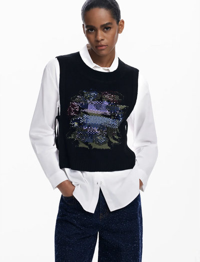 Elevate your layering game with this knitted vest, featuring a unique textured design on the front. Side ties add a touch of adjustability and style to this versatile piece.