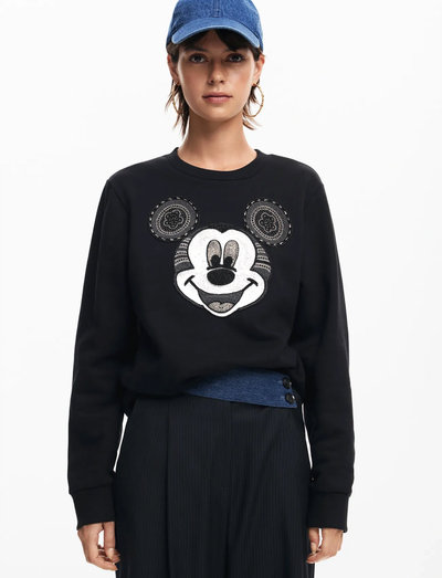 This stylish sweatshirt features a large Mickey Mouse design on the front. The design is made with sequins and embroidery, adding a touch of sparkle and detail. The sweatshirt is made from soft cotton, making it comfortable to wear. It is perfect for casual wear and can be dressed up or down.