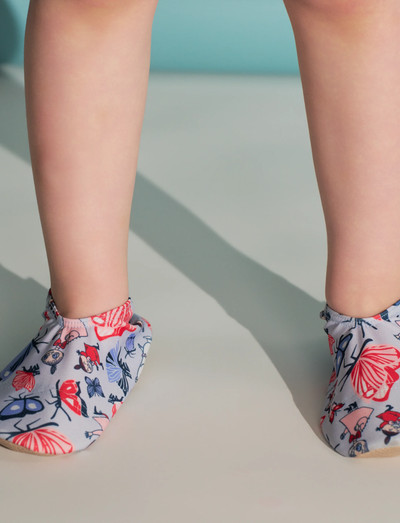 Soft and comfortable Moomin non-slip shoes for babies. The elastic non-slip shoes can be worn for example inside and on the beach. The shoes are made from sturdy polyester blend.