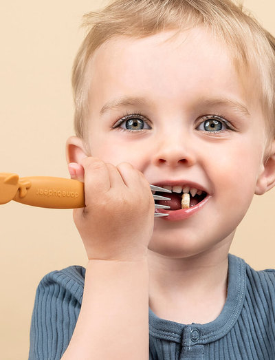 The Peekaboo dinner set is designed to trigger the curiosity of little eaters. Elphee, Wally and Croco peek out from the dinnerware - making mealtime an extra fun time of the day. A perfectly sized dinner set for first meals and for learning to self-feed The cute plate, fork and two handled cup are made of food grade silicone. It makes the Peekaboo dinnerware shatterproof as well as adding anti-slip/easy-grip features and making the Peekaboo plate and cup suitable for use in the microwave. Little ones will enjoy having the animals join them for mealtime - discover Croco at the bottom of their cup when they drink and have Elphee and Wally help them reach this exciting milestone of eating on their own. In a mix of grey, green and mustard.