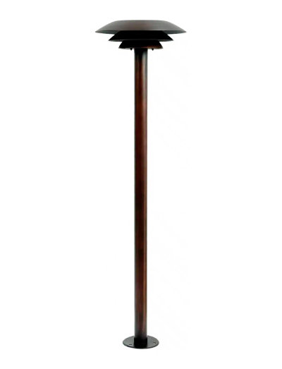 DL25 Path Lamp in antique brushed copper from Dyberg Larsen. Iconic three-layered shades provide warm, pleasant lighting for pathways, driveways, and gardens. Aluminium shades with antique copper finish; stainless steel base with protective coating for Nordic weather. Timeless design, 90 cm high, combining style, durability, and atmospheric outdoor lighting.
