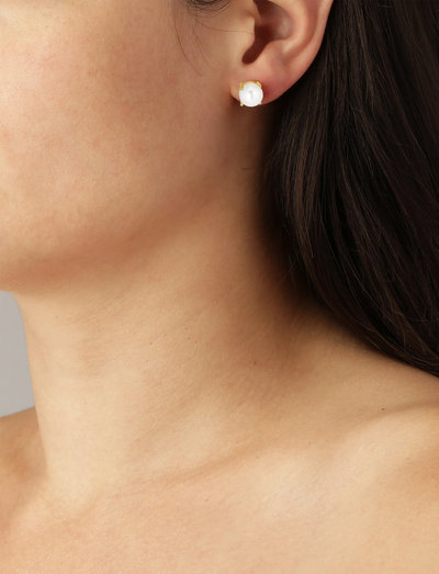 DAZE - a mid-sized stud earpost made in polished brass with a light and simple prong setting. Surgical steel post. A large facetted solitaire crystal adorns the front - about 8 mm in diameter. Here shown with a classic white faux-pearl on a gold tone finish. Nickelfree and antiallergenic. Danish design.