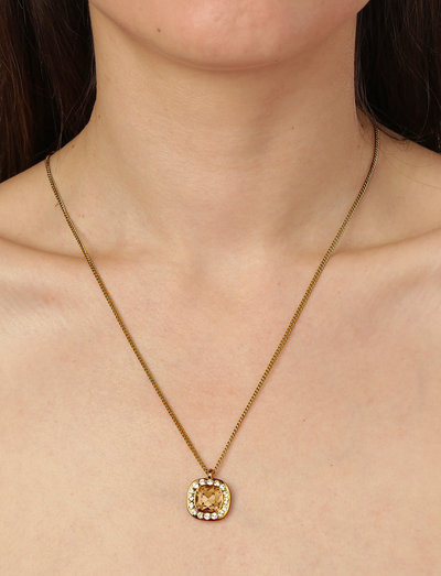 KELLY is a feminine and classic chain, created with a pendant made in brass with a cushion cut crystal - bordered with a row of handset crystals in neutral shades 40 cm + extension. Here shown in a golden crystal with golden toned finish. Nickel free Danish design.