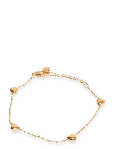 Barley Bracelet Multi Gold will quickly become a firm favourite with its attractive heart decorations. Barley bracelet multi has four hearts linked via a thin graceful anchor chain, shown here in polished 14K gold plate. Size of hearts 5x5 mm, adjustable length of chain 15,5-18,5 cm. Nickel safe. Water resistant.