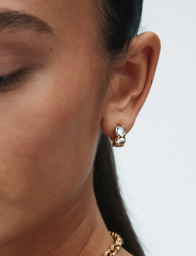 Ocean Gem features organic forms and shimmering details. The hoops, seen here in 14K gold plating, have large, sparkling stones and a hidden screw that ensures they are easy to put on and take off. Diameter 15 mm, width 7 mm. Cubic zirconia, shiny 14K gold plating on stainless steel. Nickel free. Water resistant.