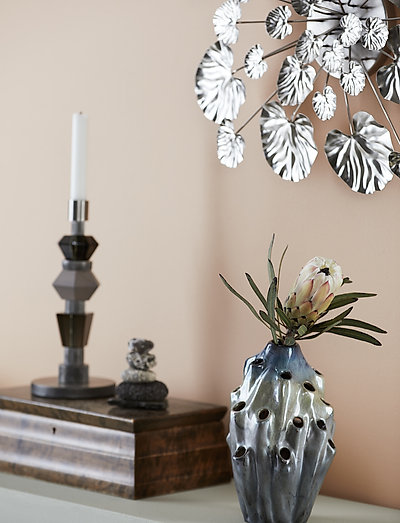 Lava Vase S is ceramic with a unique handpainted running glaze in blue, green and light grey, with a mother of pearl shine in the surface. The lower part of the vase is dull and the greyish colors melt together. Each vase is a unique and a handpainted piece of art. This design is a really statement piece. The Lava vase Rose is equally good without flowers and works very well as a sculpture. Wether you want to style with a few grasses or many flowers, you can create so many looks, by using one or more of the holes.