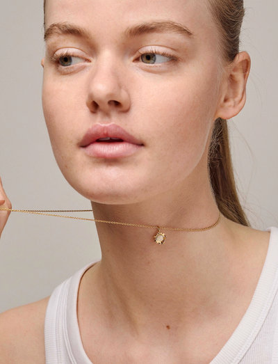 the sunshine necklace with a beige center has an exclusive and sweet expression. the sunshine necklace in the colour daisy is for the calm, sweet person who has a big heart and a loyal character. the sunshine necklace is a perfect gift idea for the person who brings a smile to your face. the pendant of the necklace depicts a sun or a sunflower, depending on the eyes looking at it, and has a classic yet different expression. the design is handmade, and the enamel is applied by hand.