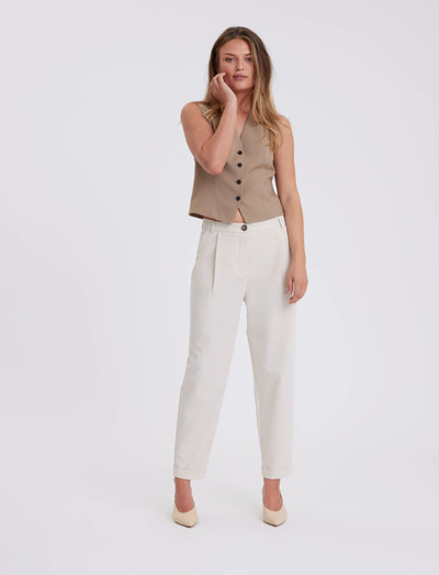 MalouFV are tapered-fit trousers. Being mid-waisted, we shaped them to rest on your hips, accentuate your hips and thighs, and end at your ankles. Some also wear them high on the waist for a different look and feel. Two double-welded back pockets—one with a flap and a beautiful front pleats and turn-up hems underline their menswear-inspired look.