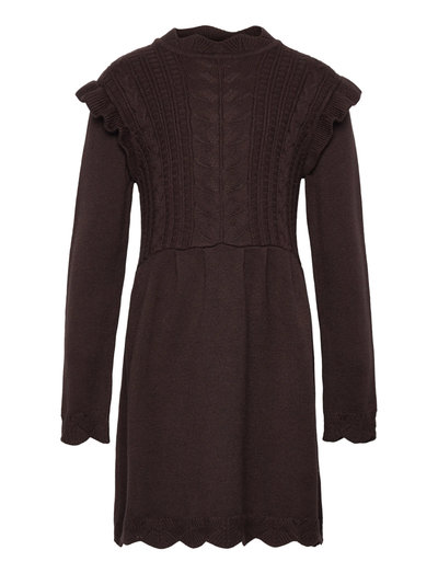 Knitted dress in a soft quality. A long-sleeved dress with a wavy collar, as well as patterned details at the hem and sleeve opening. The dress has long sleeves and is cut at the waist with a skirt with pleats that provide some volume and make the dress feminine. The fit has a trendy and sweet look.