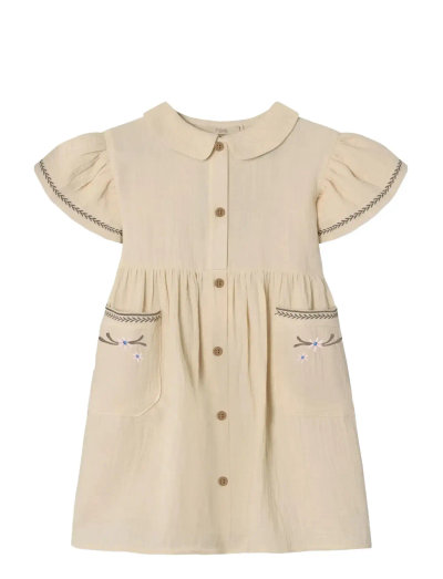 Dress in a soft muslin quality. The dress has short sleeves with embroidery at the end of the ruffle. The dress has buttons down the front and can be buttoned up from the waist and up. The dress has a nice round collar, giving a sweet look. The dress has attached pockets where you can store small stones and beads. The pockets have embroidered flowers and trim along the pocket opening. Detailed information: - 100% Cotton - Machine wash at 30°C - Short spin cycle - Do not bleach - Do not tumble dry - Iron at lowest temperature - Do not dry clean
