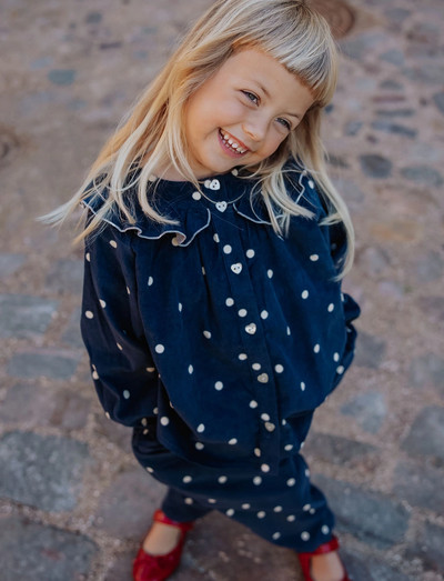 Fine soft velvet blouse in dark blue with sandshell dots. The blouse has long sleeves with elastic at the bottom, down the front, it has blue heart-shaped buttons. The neckline is round and has a yoke where a beautiful collar forms a lovely detail on the blouse. The blouse is perfect for winter parties and can be styled with our DOLLY DOT PANT in the same quality and dots.