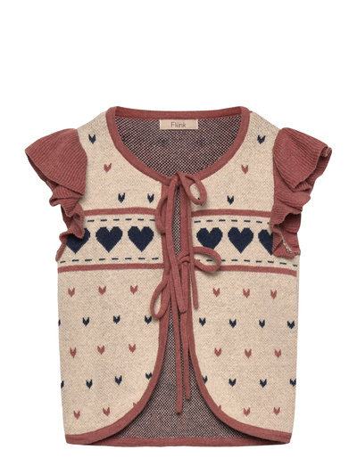 Knitted vest in a soft quality with knitted jacquard pattern with hearts, the front of the vest closes with ribbons that can be tied into pretty bows. The vest has a round neckline, ruffles at the shoulders for a nice detail, and contrast trim along the front, bottom, and neck.