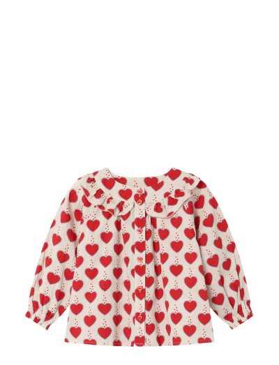 The blouse has long sleeves with elastic at the bottom, down the front it has red buttons shaped like hearts. The neckline is round and has a yoke where a fine collar creates a beautiful detail on the blouse. The blouse features a lovely heart print in beautiful colors, bringing a smile to your face. Detailed information: - 100% cotton - Machine wash at 30°C - Short spin cycle at half load - Do not bleach - Do not tumble dry - Iron at lowest temperature - Do not dry clean - Lay flat to dry