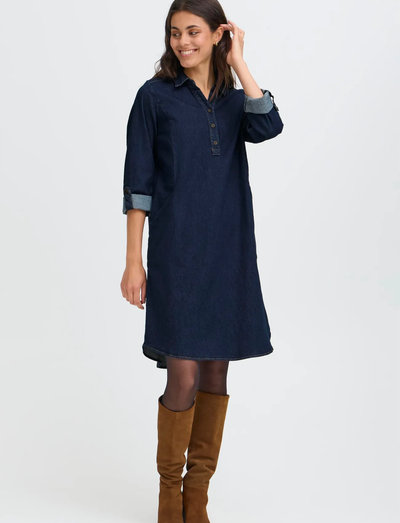 Crafted from soft denim, this shirt dress offers a relaxed silhouette. The design features a collared neckline and three-quarter sleeves with buttoned cuffs, providing versatile styling options.