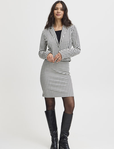 This blazer is a stylish and versatile piece of clothing that can be dressed up or down. It features a classic houndstooth pattern and a flattering fit. The blazer is made from a soft and comfortable blend of polyester, viscose, and elastane. It is perfect for adding a touch of sophistication to any outfit.