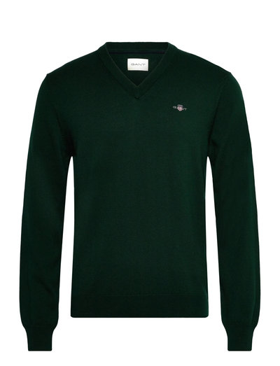 Invest in premium knitwear with this GANT sweater. Crafted from a cotton-lambswool blend in a fine weight yarn, this versatile knit has a regular fit and a classic V-neck. Perfect for the fall-winter season, it is complete with ribbed detailing and a subtle '80s-inspired GANT shield graphic embroidered at the chest. Style with jeans and boots for simple yet smart dressing.
