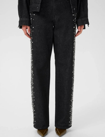 Wide fitThese wide-leg jeans offer a contemporary silhouette with eye-catching embellishments. The studded detailing along the sides adds an edgy touch, making them a standout piece for any wardrobe. Pair with a simple top to let these jeans take centre stage.