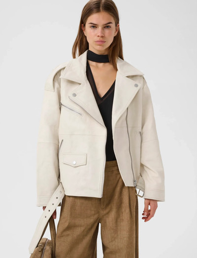Crafted in a classic biker silhouette, this jacket features an asymmetrical zip closure and belted waist. The design incorporates functional zip pockets and shoulder epaulettes, adding an edgy touch to the timeless style.