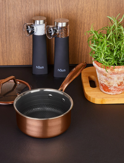 The Hâws Santo Rose Gold Series 1.5 L saucepan with lid combines functionality, quality and style in an elegant and compact design. Built with advanced 3-lay er multi-ply technology – stainless steel on the outside and inside with an aluminium core – the saucepan en sures fast and even heat distribution for perfect cook ing results. The PFAS-free hybrid non-stick coating is durable, easy to clean, and safe for use with metal utensils. The saucepan is oven-safe up to 260 °C (without lid) and can withstand temperatures of up to 400 °C on all types of hobs, including induction. The heat-insulated handle provides a secure and com fortable grip, even at high temperatures. Certified according to the Recycled Blended Claim Standard, meaning that parts of the materials come from verified recycled content – a guarantee of respon sible production and supply chain transparency. A stylish and versatile choice – ideal for both everyday cooking and more demanding recipes. Discover more matching products in the Rose Gold Series.