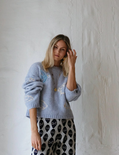 The Astrid Knit Sweater brings the dreamy Helmstedt aesthetic to life with its sky-blue palette. Its cloud motifs and pearl embroidery evoke a sense of both coziness and elegance. The ideal sweater for year-round wear, with ribbed cuffs and hem for a comfortable fit.