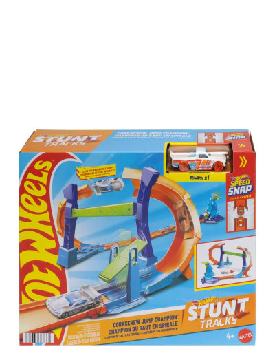 Become the Corkscrew Jump Champion with this adjustable track set! Kids can experiment with their launching skills as they master the corkscrew loop that can separate in the middle for an epic mid-race jump. Start with the corkscrew completely connected, then gradually pull it apart to increase the jumping distance and the challenge. Stick the landing and race through the flipper and off to more track challenges. This set is designed with Speed Snap Track for quick and easy assembly and includes two adapters for compatibility with legacy Hot Wheels e-track. One 1:64 scale die-cast car is included for immediate racing. Additional tracks and sets sold separately. Colours and decorations may vary.