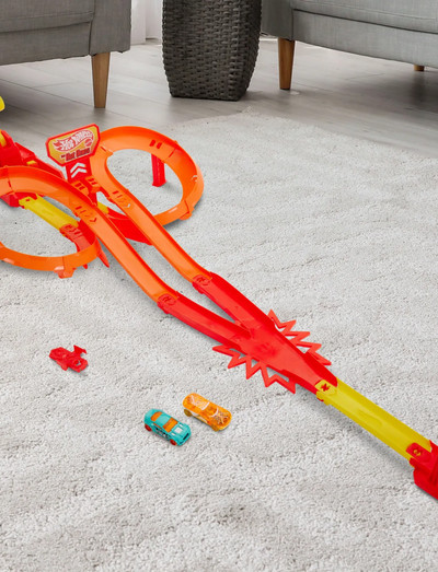 Race two Hot Wheels die-cast cars and see who will survive the crash zone and be the first to speed through the flipper of The Hot Ones Crash Speedway Frenzy track set. Release vehicles from the side-by-side launcher to send them careening around two separate curves before merging at the crash zone. The winner will stay on track and burst through the flipper before heading off to other challenges. The set is fitted with Speed Snap Track and includes an adapter for reverse compatibility with legacy Hot Wheels e-track. Additional sets and tracks sold separately. Colours and decorations may vary.
