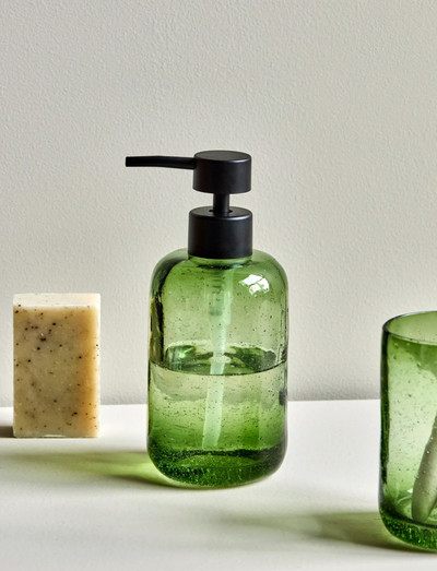 The HDWah soap dispenser is made of deep green glass with subtle air bubbles and comes with a matt black pump. The minimalist design combines durability with a refined look.