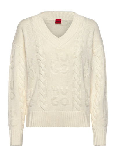 Loose fit jumper/ drop shoulder/ prepy v-neck/ long sleeve/ all over logo cable structure/ soft wool blend