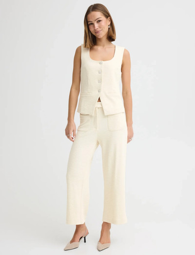 With its button-up design, this sleeveless blazer offers a versatile layering option. The textured fabric and tailored fit create a polished look, suitable for both professional and casual settings.