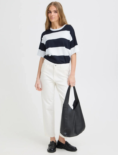 Featuring a bold, horizontal stripe design, this short-sleeved top offers a relaxed, loose fit. The classic crew neck and straight hem make it a versatile addition to any wardrobe.