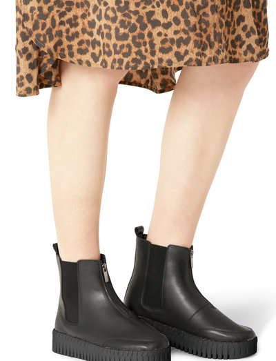 Introducing the Tulip Chelsea Boots on a plateau sole by ILSE JACOBSEN HORNBÆK, where style meets functionality. These boots feature an elastic side panel and an Aquaguard zipper at the front for easy slip-on comfort. Crafted with a recycled microfiber upper, complete with a PU surface, and lined with plush faux shearling in 100% polyester, these boots offer warmth for the winter. The platform sole consists of 75% natural rubber and 25% recycled rubber, secured with waterproof glue to keep you dry in any weather. Step out in style, comfort, and confidence with these waterproof and eco-conscious boots. Don't forget to impregnate them upon receipt and regularly for enduring performance and elegance.